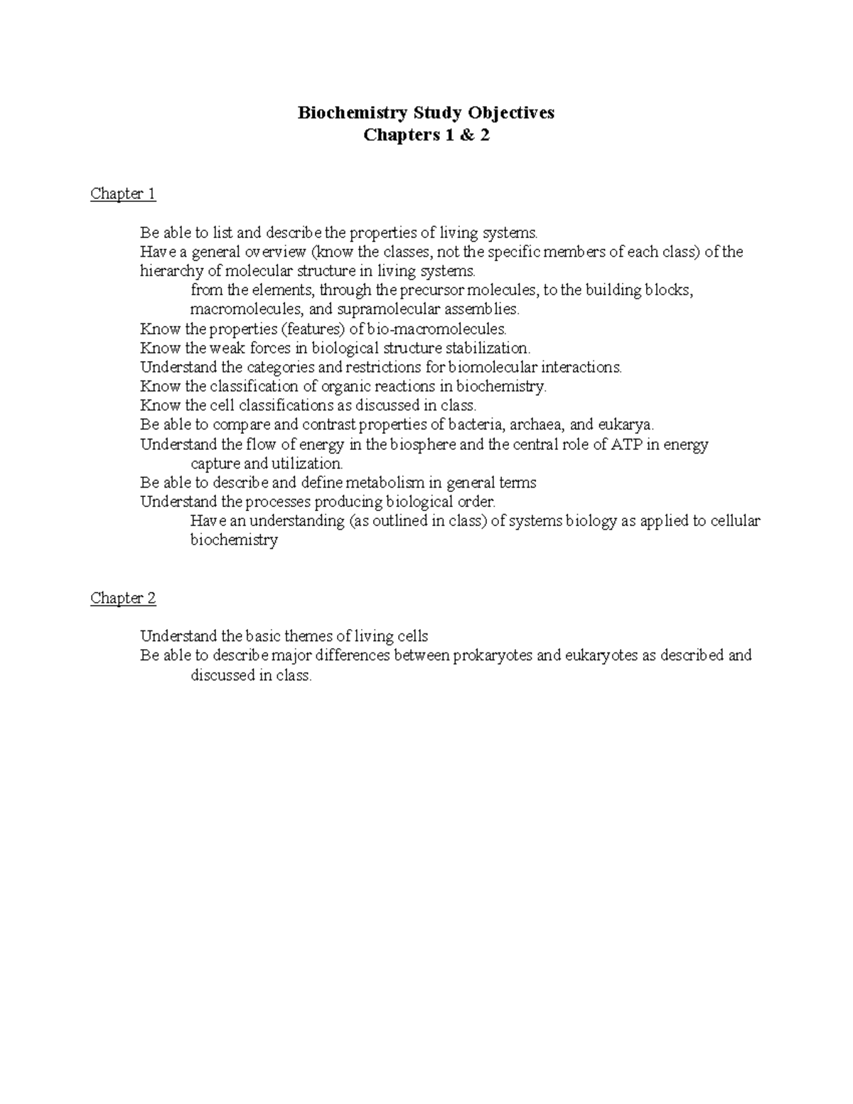 Objective Ch12 Biochemistry Study Objectives Chapters 1 & 2 Chapter 1 Be able to list and