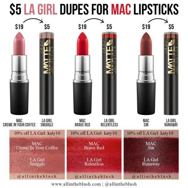 5 LA Girl Dupes for MAC Lipsticks All In The Blush Lipstick Dupes 2022 From foundation and concealer to eyeliners and lip glosses, all these products are just as good (and some are even better) as their expensive counterparts, so you can feel like your favorite celebrity for far less of the cost. Nars orgasm blush, diorshow mascara, and clé de peau concealer). Shop dupes for charlotte tilbury, nars, and more. But sometimes a. Lipstick Dupes 2022.