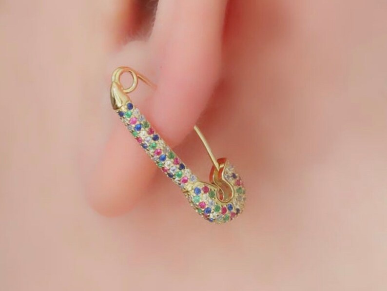 925 earrings SAFETY PIN hoops dainty cz gold earrings Etsy Are Hoop Earrings Safe From choosing the right hoops to opening and closing them properly, these tips will give. Adding a necklace or earrings can give your outfit that final bit of polish. A tip for understanding hoop earring sizing: Whether you are in the bath, shower, hot tub or having a swim, you should always take off your hoop earrings and store them. Are Hoop Earrings Safe.