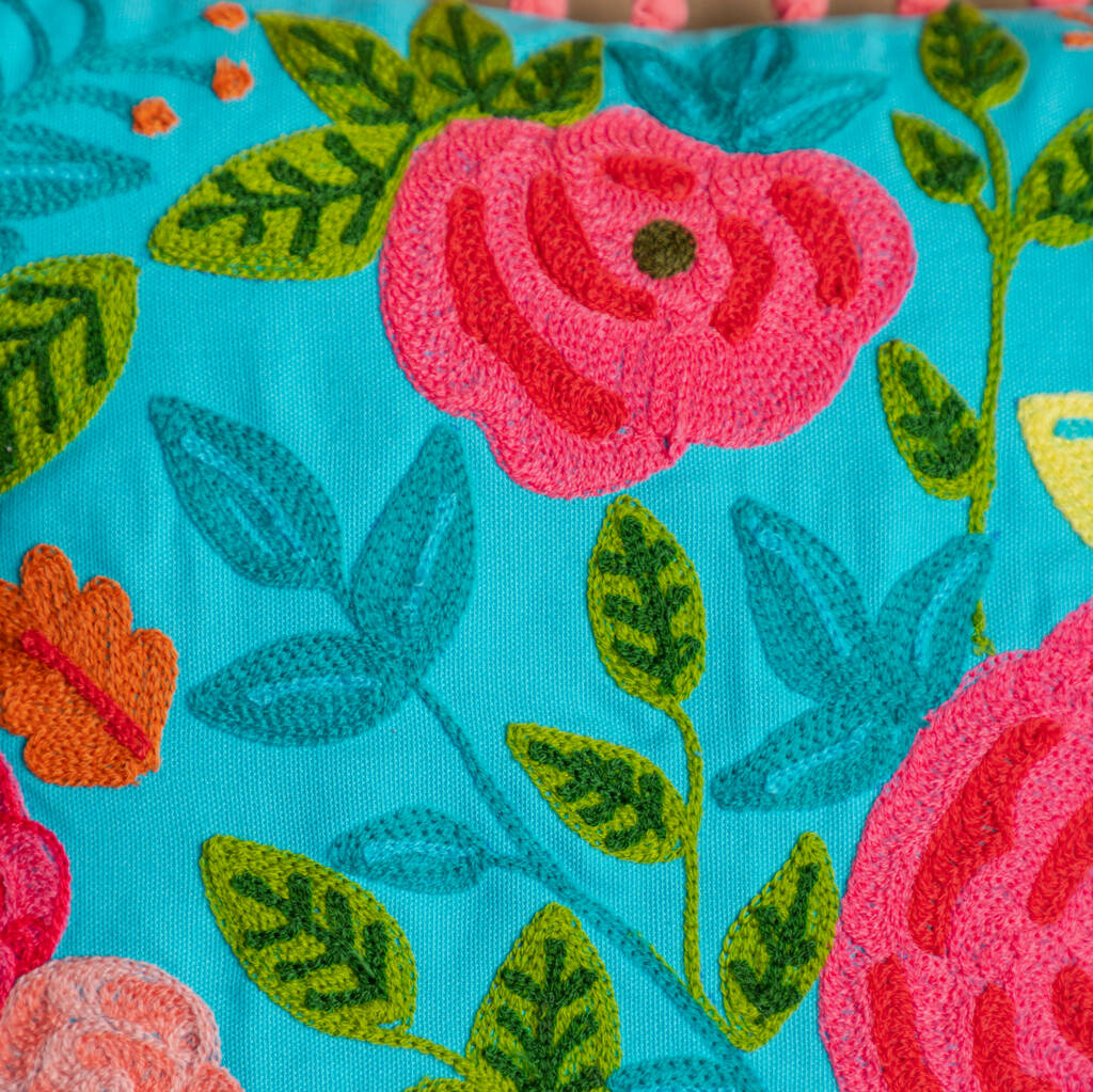 Turquoise Floral Embroidered Cotton Cushion Cover By Birch & Yarn