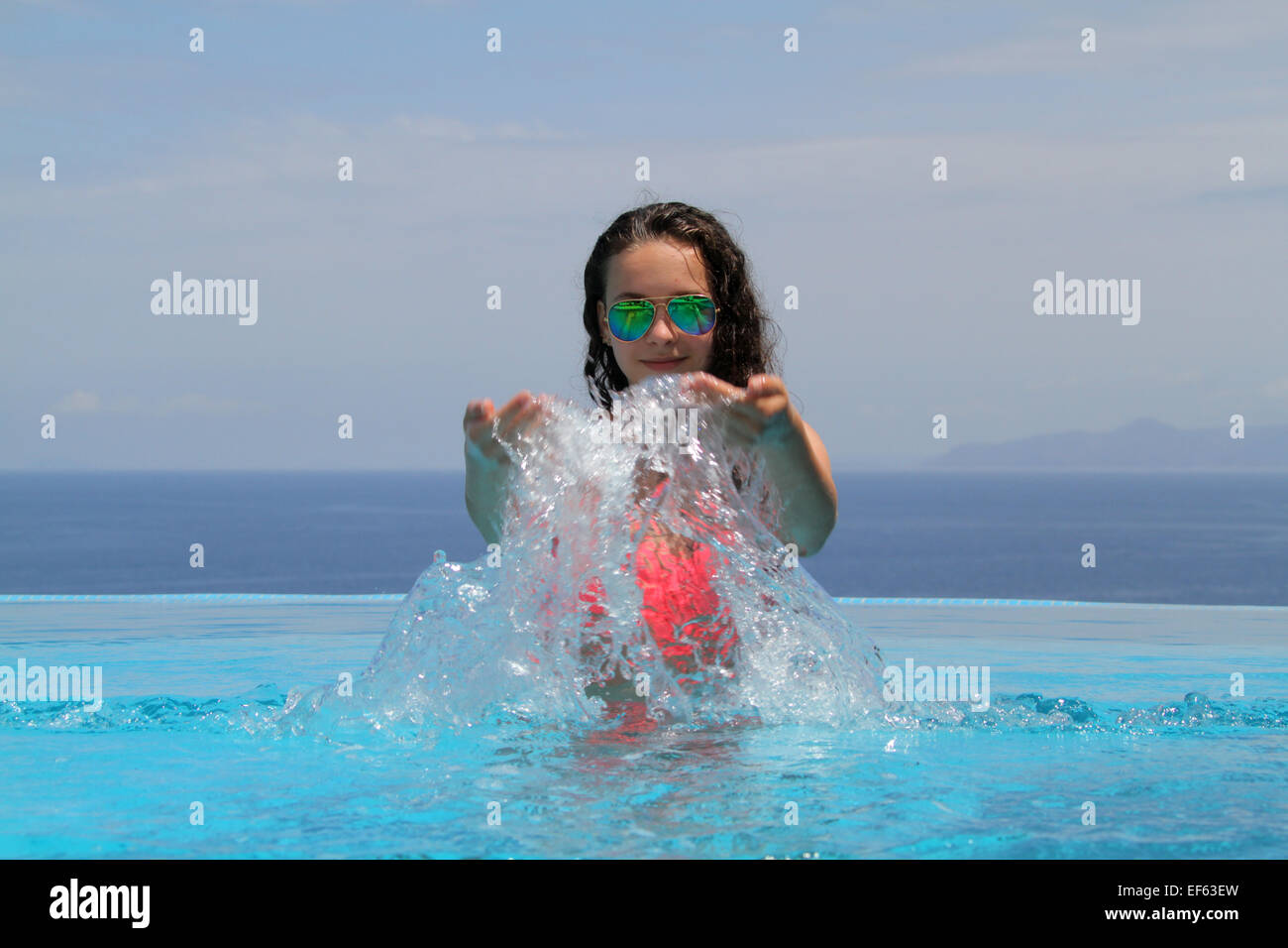 TEENAGE GIRL IN PINK BIKINI SPLASHING ELOUNDA CRETE GREECE 05 May 2014