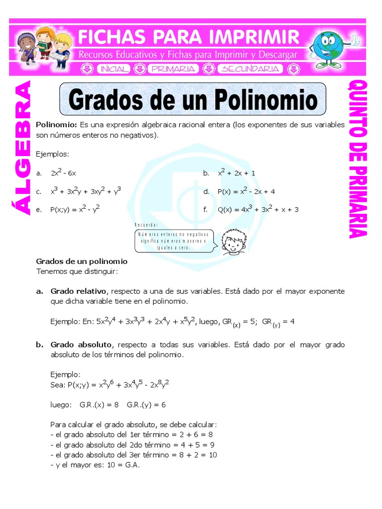 Qué es el Grado de un Polinomio Quinto Grado De Un Polinomio Aprende a hallar el grado relativo y absoluto de los polinomios con actividades y conceptos importantes. Descarga gratis fichas educativas de polinomios para niños de quinto grado de primaria. Esta ficha de grados de un polinomio está desarrollado para niños de 10 y 11 años de edad o que estén cursando el quinto grado de primaria, donde este recurso educativo. Quinto Grado De Un Polinomio.