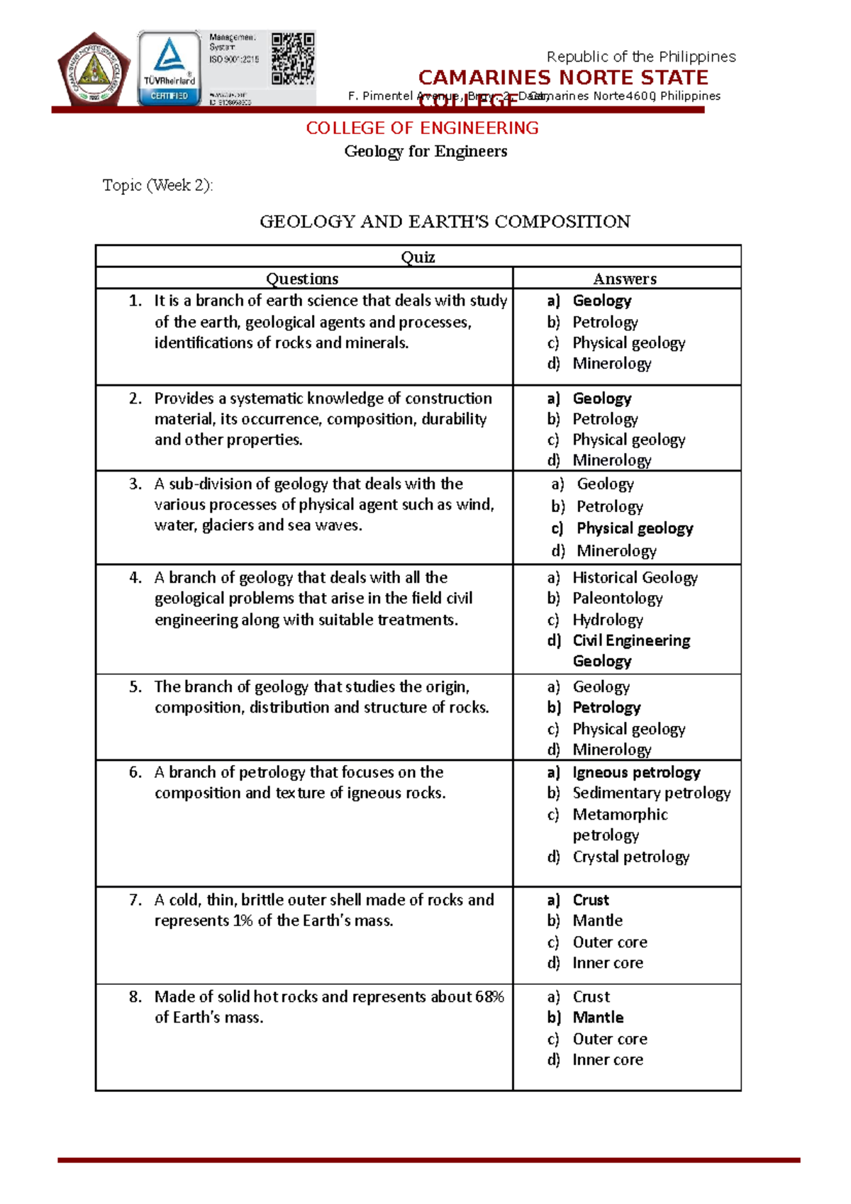 GeologyQuiz week 8 for geology COLLEGE OF ENGINEERING Geology for