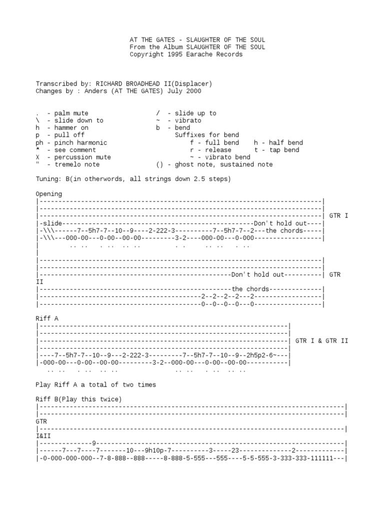 Download original guitar pro tab. Slaughter of the soul tab by at the gates. Slaughter of the soul by at the gates tab different versions chords, tab, tabs. We have an official slaughter of the soul tab made by ug professional guitarists. First of all you can see. Here you can do in two ways. Play along with original audio. We have an official slaughter of the soul tab made by ug professional guitarists. Learn & play tab for bass and percussion with free online tab player, speed control and loop. Choose and determine which version of slaughter of the soul chords and guitar tabs by at the gates you can play.