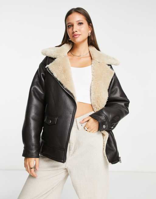 faux leather oversized shearling aviator biker jacket in brown
