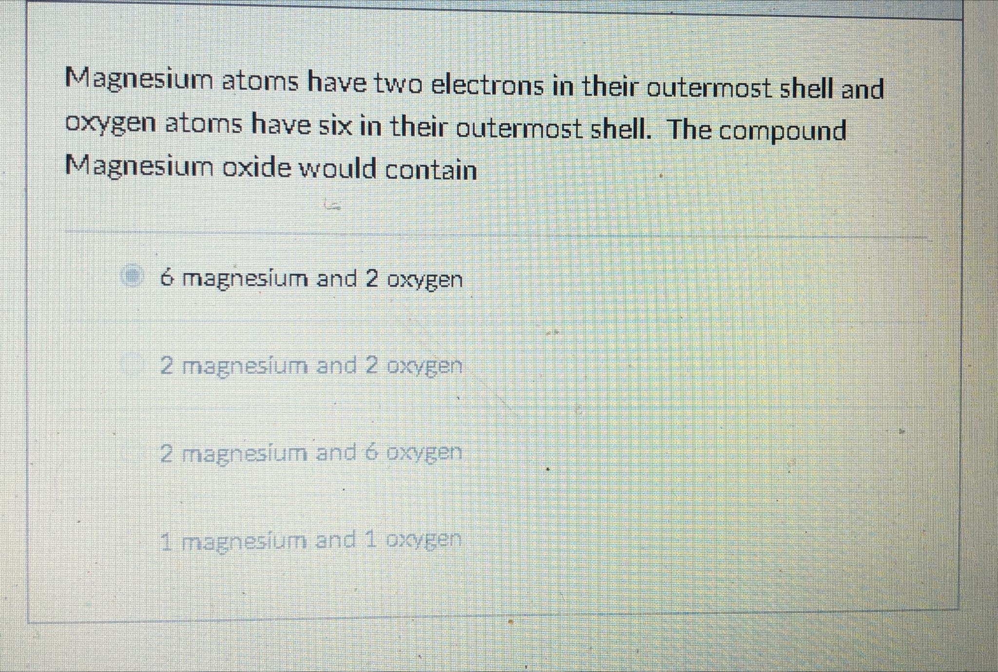 Solved Magnesium atoms have two electrons in their outermost Magnesium Bicarbonate Oxygen Atoms Magnesium and nitrogen react to form an ionic compound. Predict which forms an anion, which forms a cation, and the charges of. There are 4 easy steps to find the molar mass of mgc2o5h2o based on its chemical formula. This does not mean there are two atoms, but two types of atoms, so al 2 s 3 is a. There. Magnesium Bicarbonate Oxygen Atoms.