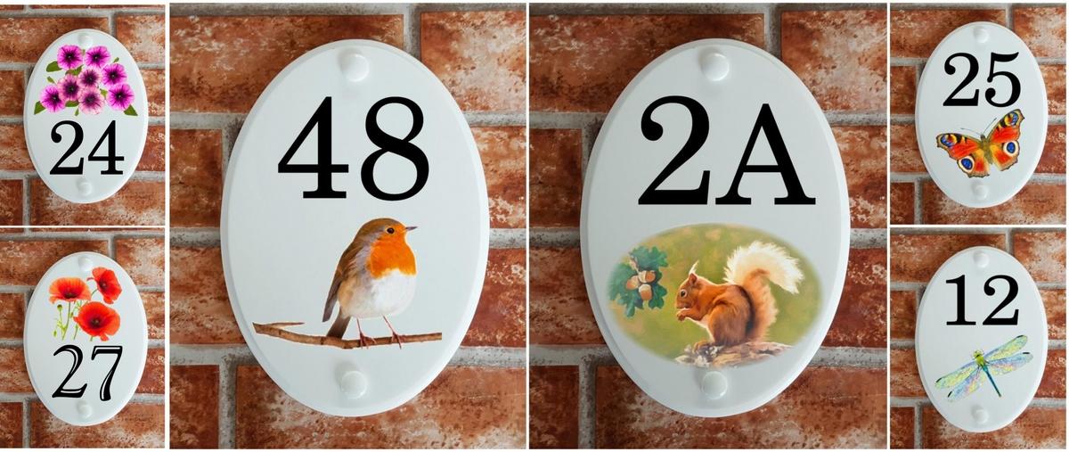 Pottery Style House Number Signs with motifs of animals and flowers