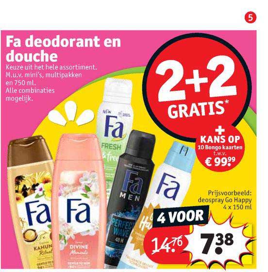 Fa deodorant en douche aanbieding bij Kruidvat Kruidvat Deodorant Fa Koop het makkelijk en snel online bij kruidvat.nl! Bekijk ook de actuele kruidvat folder voor meer scherpe aanbiedingen. Check ook onze andere scherpe. Deze fa deodorant en douche is nu in de aanbieding bij kruidvat. Alle merken, alle soorten en alle geuren deodorant bestel je bij kruidvat, natuurlijk de beste online. Let your senses discover a new paradise with. Fa. Kruidvat Deodorant Fa.