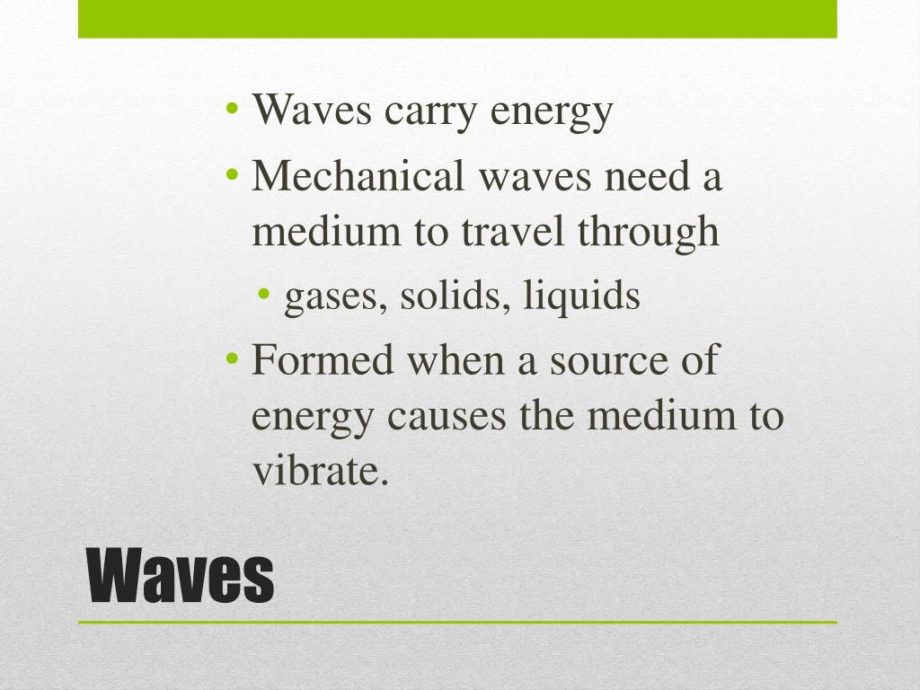 PPT Waves PowerPoint Presentation, free download ID1309906 Mechanical Waves Carry Energy Through Mechanical waves are disturbances in matter that carry energy from one place to another. The amount of energy they carry is related to their frequency and their amplitude. The higher the frequency, the more energy, and the higher the amplitude, the more energy. As a result, momentum and energy are exchanged among the particles and between the particles and the. Mechanical Waves Carry Energy Through.