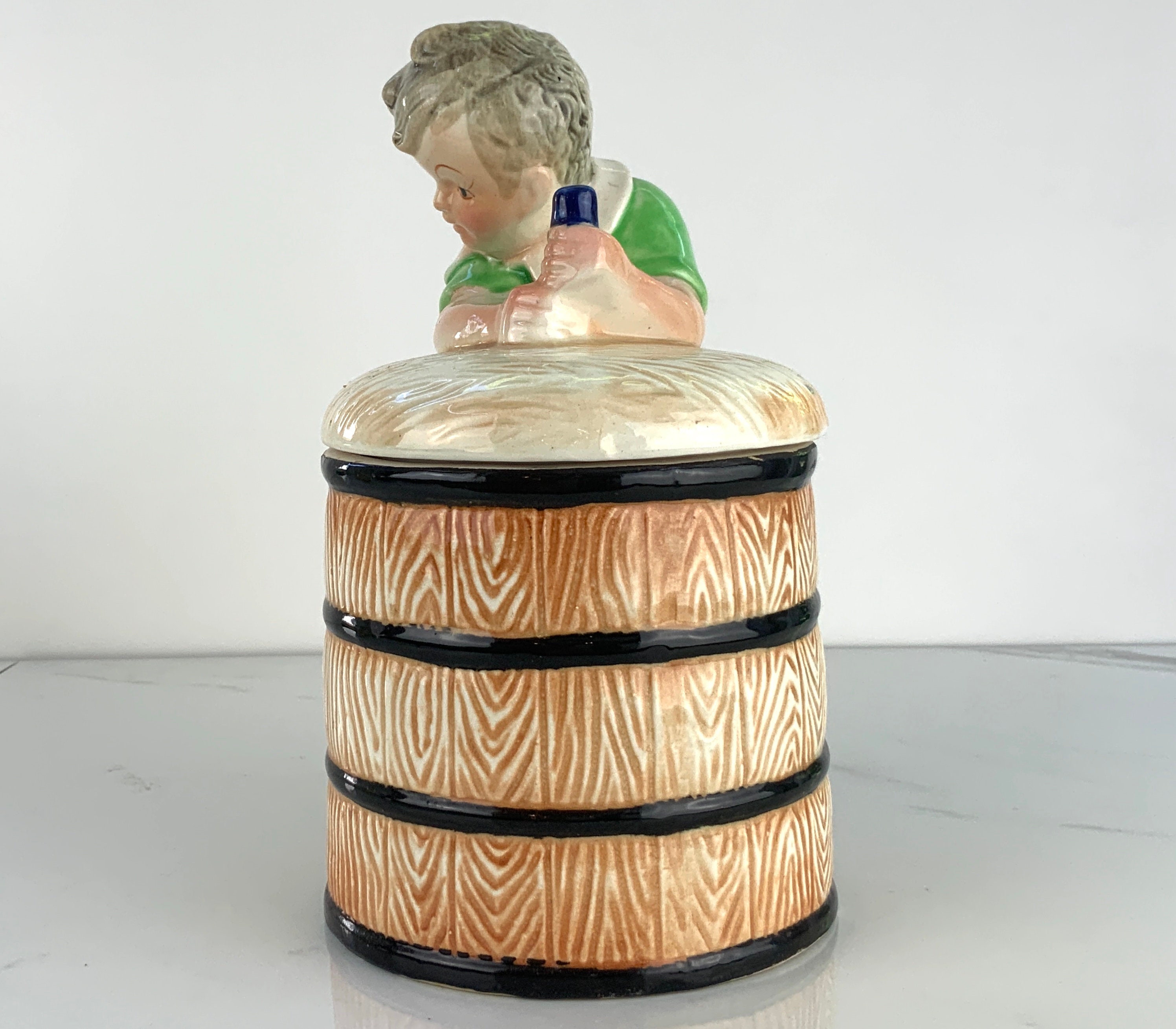 1930's Cookie Jar Little Boy Churning Butter Adorable and in Amazing Boy Churning Butter Cookie Jar — vintage cookie jar features a young boy churning butter and is made of ceramic and porcelain. — the butter churn barrel and stool are a beige or light tan color. It is unmarked but my research showed it. The barrel has a gold tip. He seems mischievous to me! find many great new & used options. Boy Churning Butter Cookie Jar.