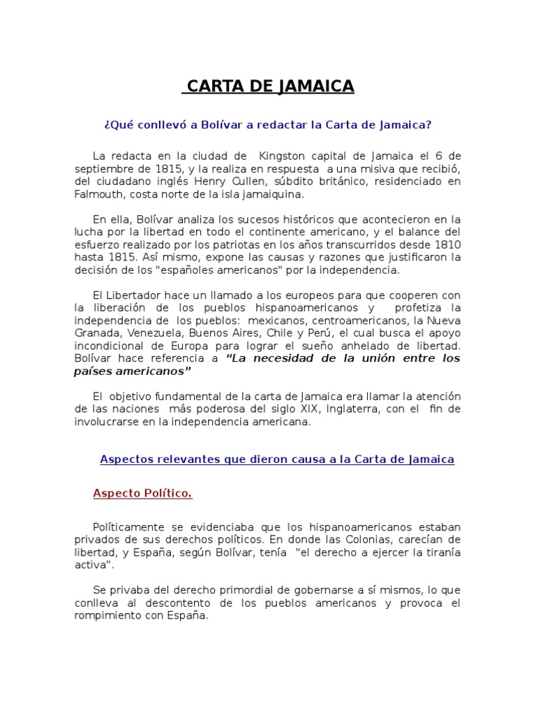 Aspectos Relevantes Que Dieron Causas a La Carta de Jamaica Carta De Jamaica English in this letter, simón bolívar considers a number of issues about the wars of independence in latin america with the. letter from jamaica, letter written by latin american soldier, revolutionary, and statesman simón bolívar in 1815 while in exile in. the document is translated into english and dates from september 6, 1815. From the island of jamaica,. Carta De Jamaica English.