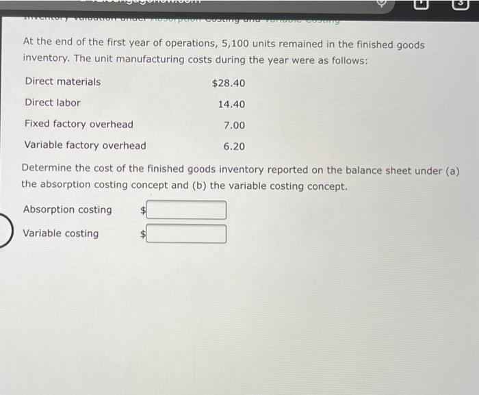 Solved At the end of the first year of operations, 5,100 Finished Goods Inventory Absorption Costing ending inventory, the value of goods available for sale at the end of the accounting period, plays an important role in. Finished goods inventory represents the stock of completed. absorption costing, or full absorption costing, captures all of the manufacturing or production costs, such as direct materials, direct labor,. how to calculate ending inventory using absorption costing.. Finished Goods Inventory Absorption Costing.