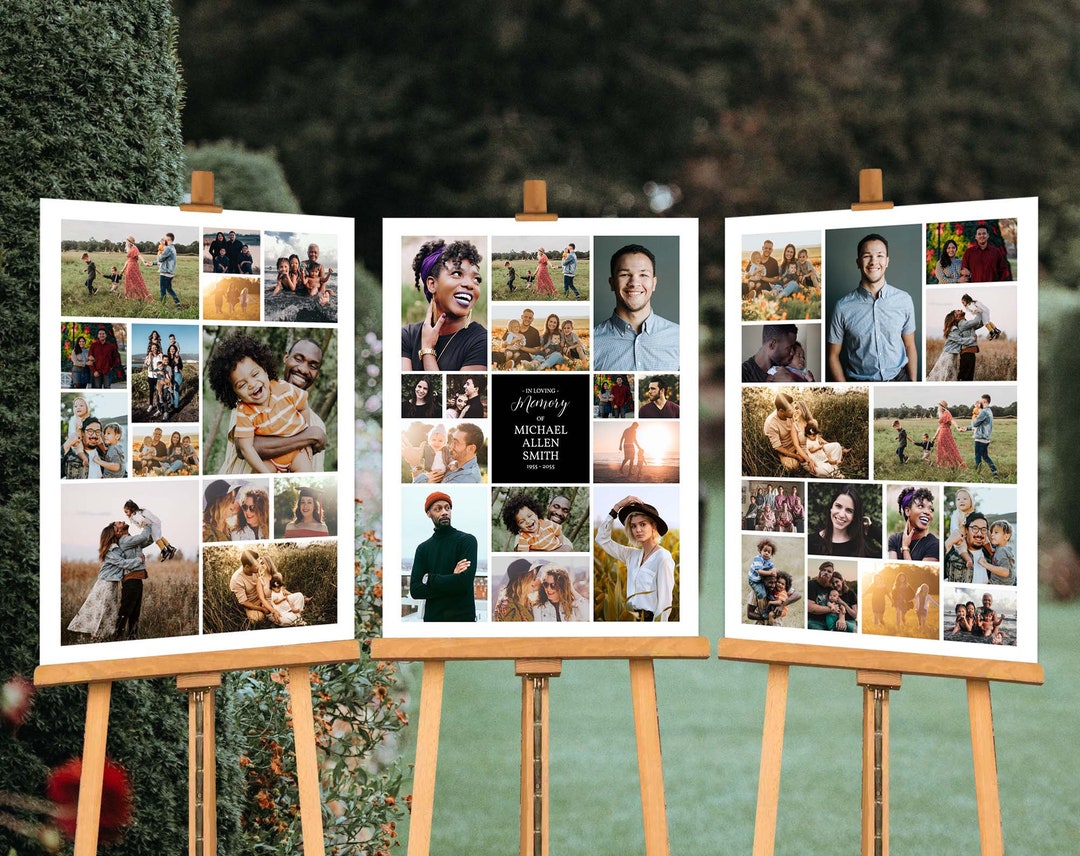 Funeral Memorial Photo Collage Funeral Display Many Frames Etsy Funeral Photo Boards having a memorial board at a funeral or memorial service will instantly help the guest to appreciate and remember their loved one from seeing photos displayed on it. design a funeral picture board and memorial posters to share photos and memories of your loved one at funeralprints.com. In short, memorial boards help people to honor the lost loved. Funeral Photo Boards.