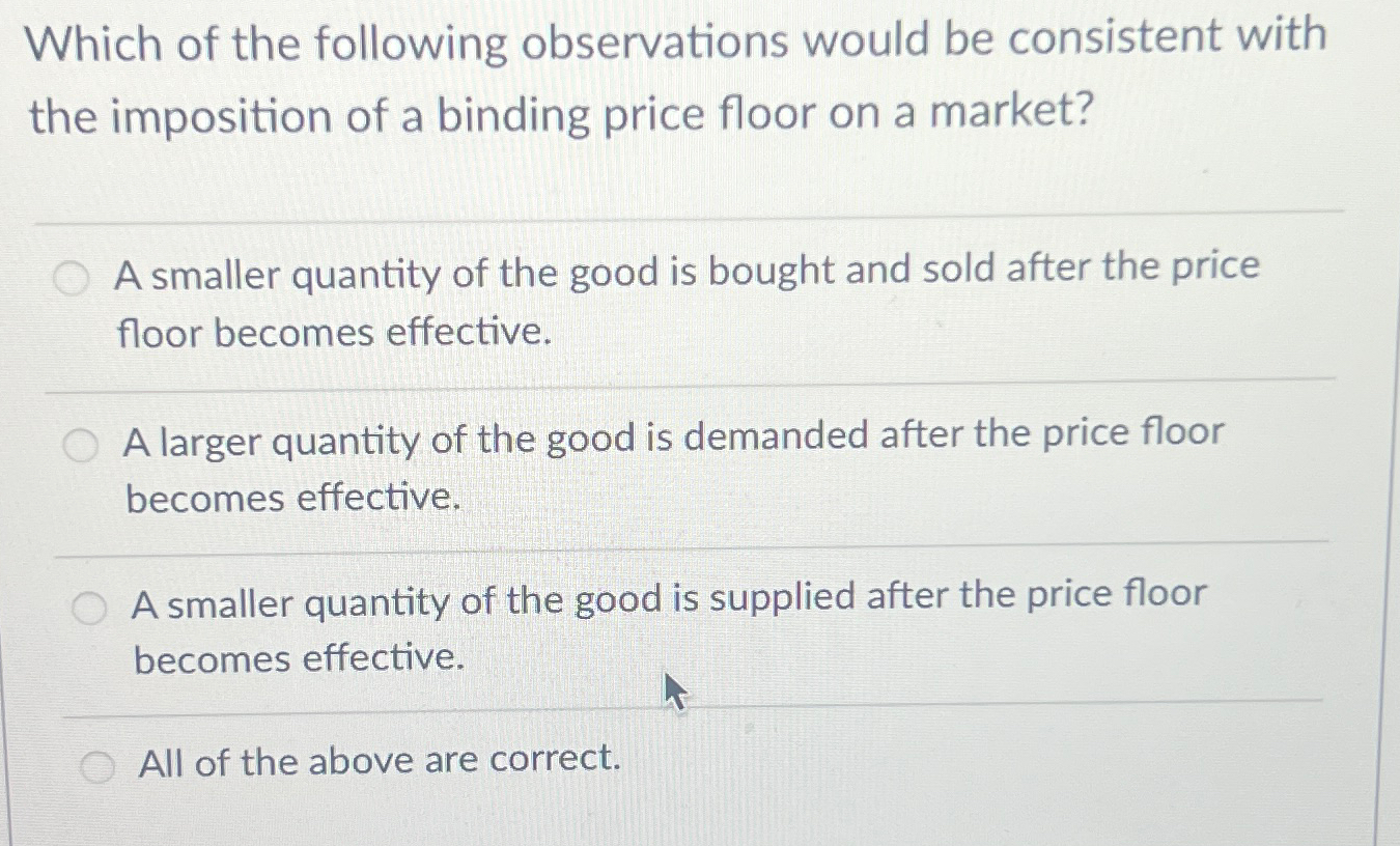 Solved Which of the following observations would be After A Binding Price Floor Becomes Effective a price floor is the lowest price that one can legally charge for some good or service. A binding price floor is above the equilibrium price and. If it’s not above equilibrium, then the market won’t sell below. for a price floor to be effective, it must be set above the equilibrium price. a binding price floor. After A Binding Price Floor Becomes Effective.