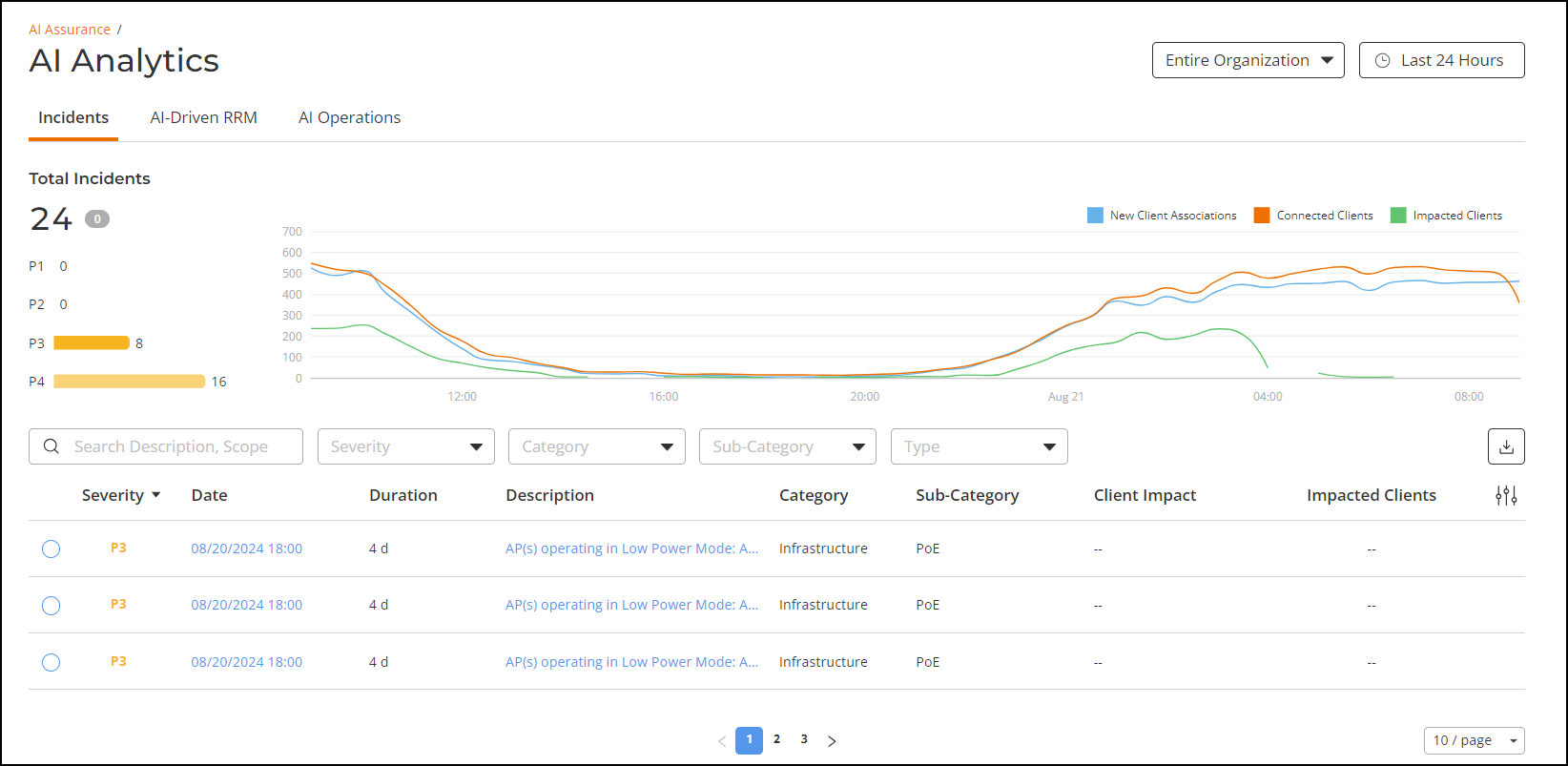 On the Navigation pane, click AI Assurance > AI Analytics > Incidents. The Incidents page is displayed, providing a breakdown of incidents by severity and category, allowing you to focus on incidents of interest, for which you can view details. Note that, by default, the information is provided for all of your networks for the last 24 hours, but you can modify the page filters for a specific network and customized span of time. For any given incident, you can view the severity, client impact, root cause, and recommendations, as well as the events, anomalies, data, or problems that were used to identify the incident.