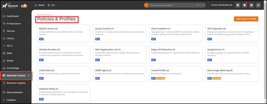 In the Policies & Profiles page, you can view the list of policies and profiles available in RUCKUS One. Note that as new policies and profiles are added to RUCKUS One, the user interface screen will be updated.
