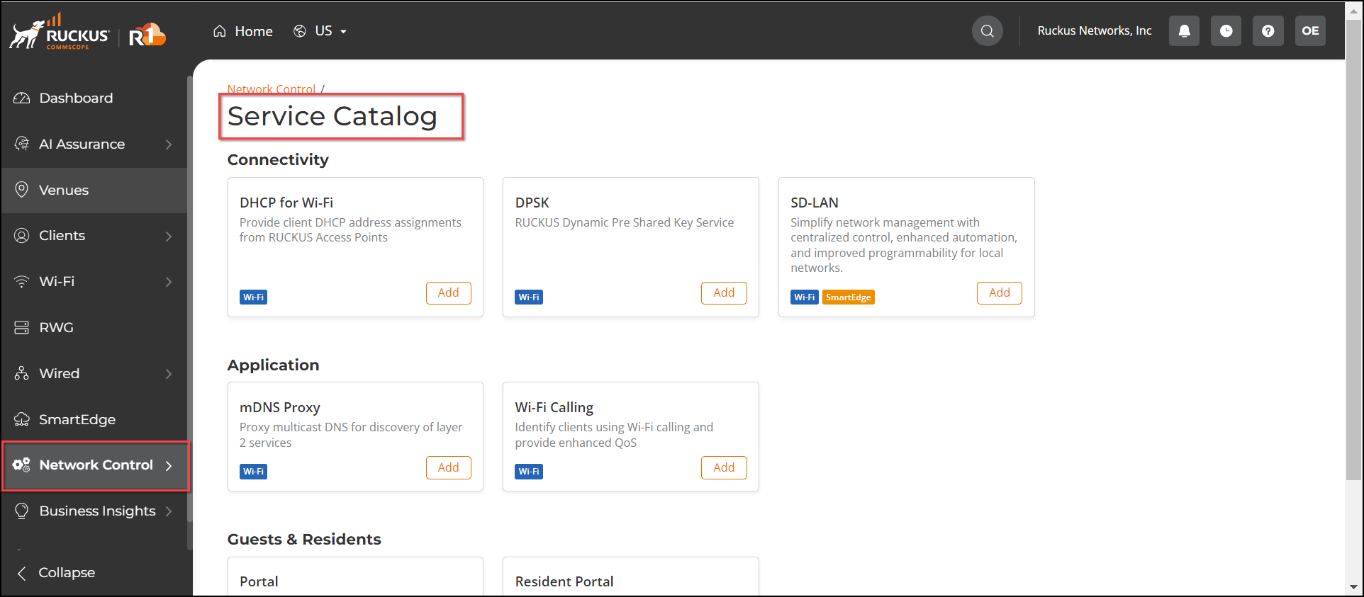 In the Service Catalog page, you can view the list of services available in RUCKUS One. Note that as new services are added to RUCKUS One, the user interface screen will be updated.