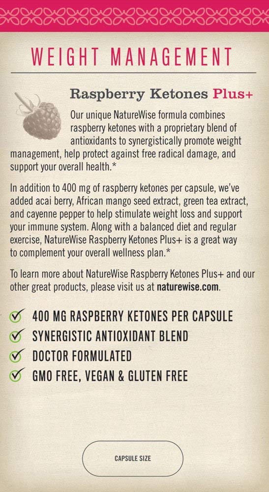 NatureWise Raspberry Ketones 400 mg Plus+ Advanced Antioxidant Blend with Green Tea for Weight Raspberry Ketones Naturewise Naturewise raspberry ketones plus review: Our unique naturewise formula combines raspberry ketones with a proprietary blend of six antioxidants intended to synergistically support the health of your body. Naturewise raspberry ketones plus+ capsules deliver 400mg. Acai berry, african mango seed extract, green tea extract, and cayenne pepper dietary supplement vegan gluten free soy free tune up your. Back to naturewise. Raspberry Ketones Naturewise.