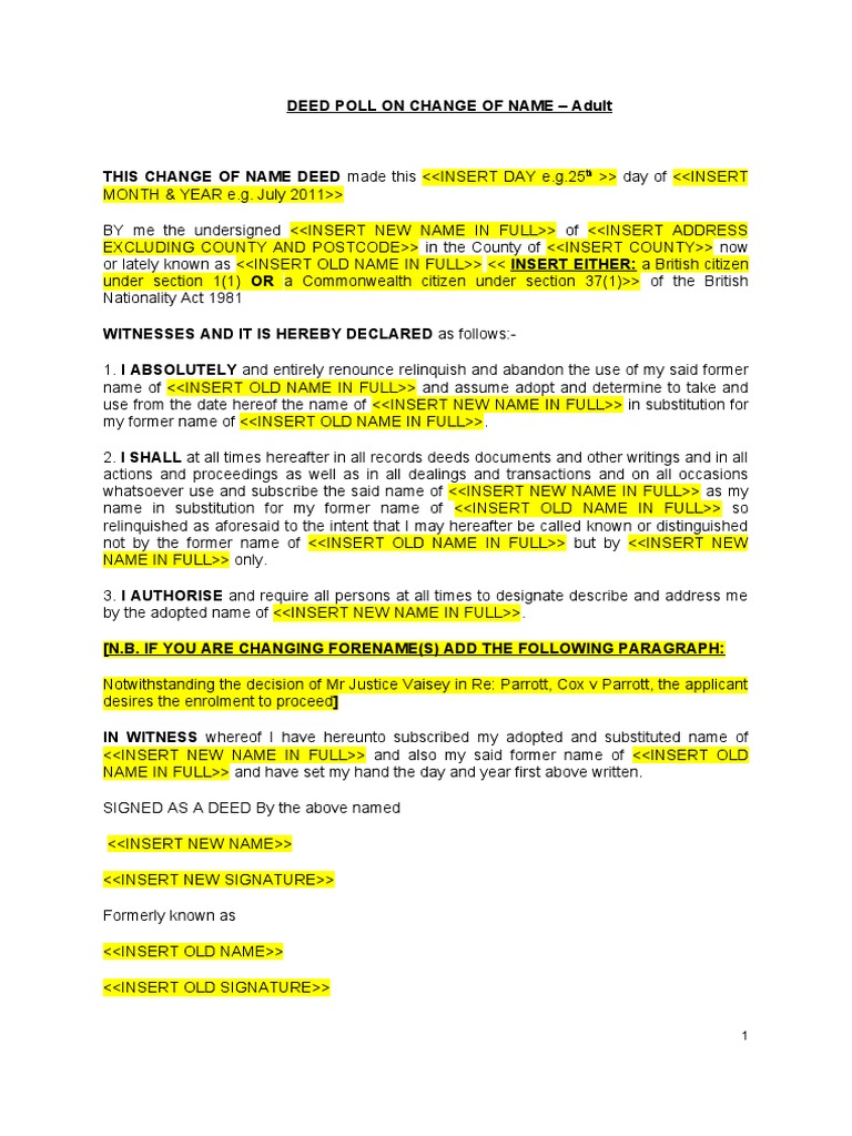 Change of Name by Deed Poll Adult PDF Legal Documents Government