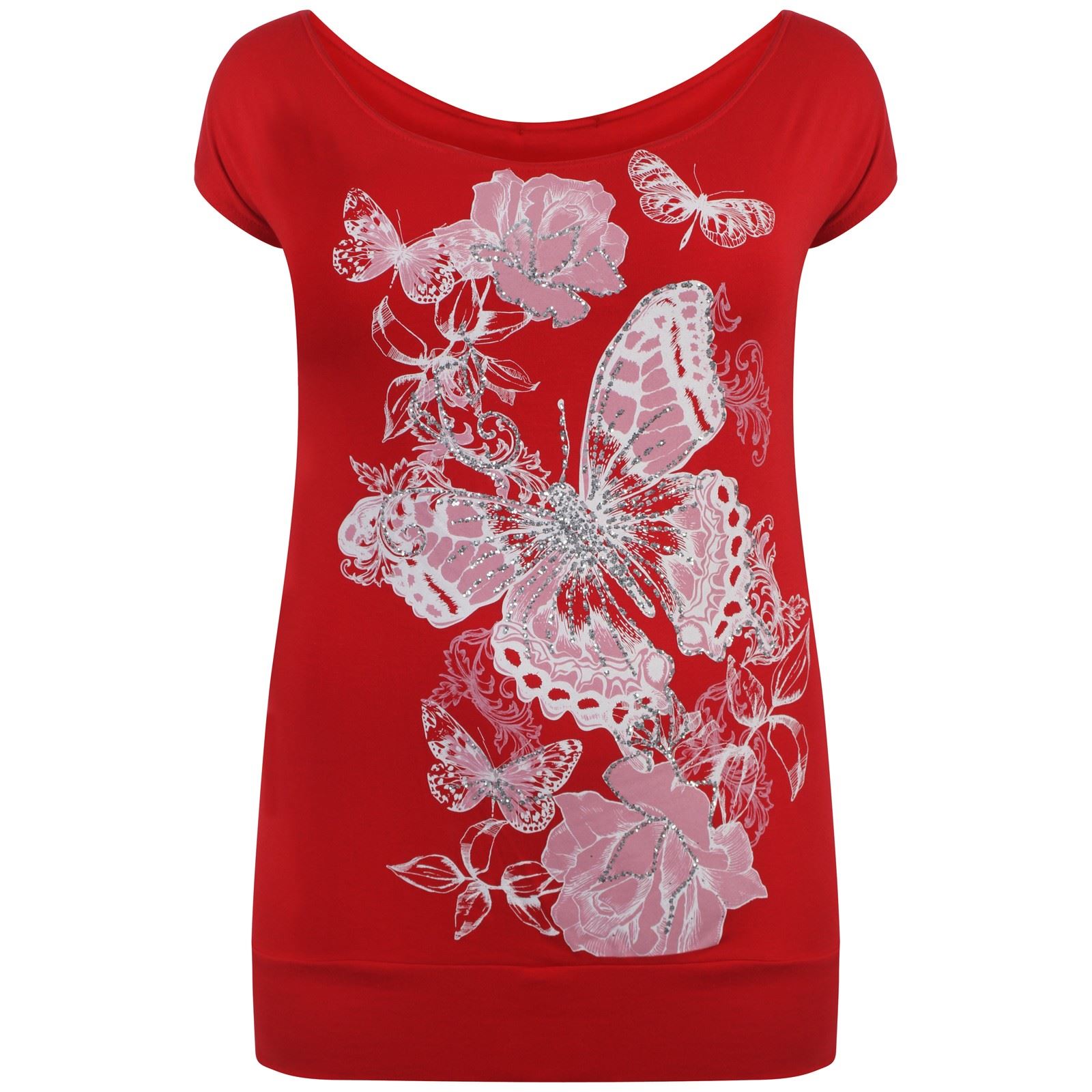 New Ladies Butterfly Sequins Floral Print Off Shoulder T Shirt Tunic