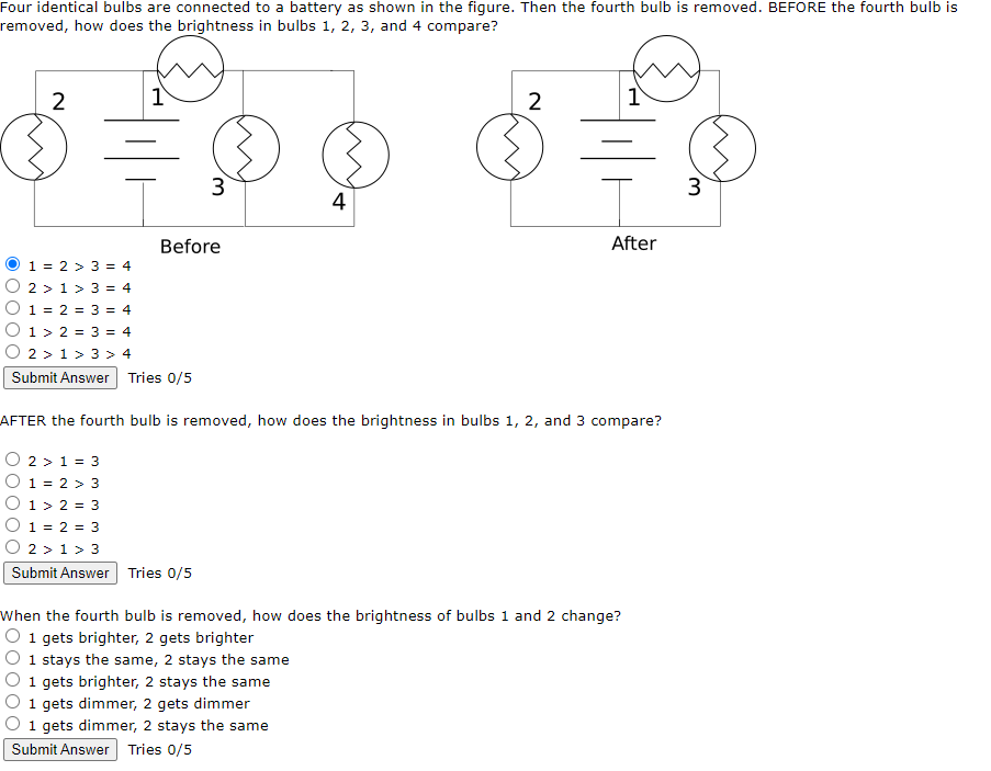 Solved Four identical bulbs are connected to a battery as Consider Four Identical Bulbs Connected In Series To A Battery Adding a fifth bulb in parallel increases the illumination of the four bulbs in series due to a lowered overall circuit. What is the relation between ib. Explain the change in brightness of the light bulb if an identical light bulb is added to the circuit in series. How will this change the illumination of the first four bulbs? Two. Consider Four Identical Bulbs Connected In Series To A Battery.