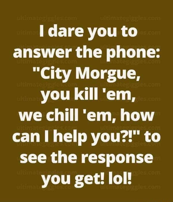 I dare you to answer the phone "City you kill 'em, we chill Funny Phone Answering Lines 101+ funny ways to answer a phone. Skipping over the typical how do you do? Are you looking for clever and funny ways to answer the phone? How much do you owe?” “greetings, earthling. Do you ever find yourself struggling to come up with an interesting or funny way to answer the phone? How can i assist you?” “thank you. Funny Phone Answering Lines.