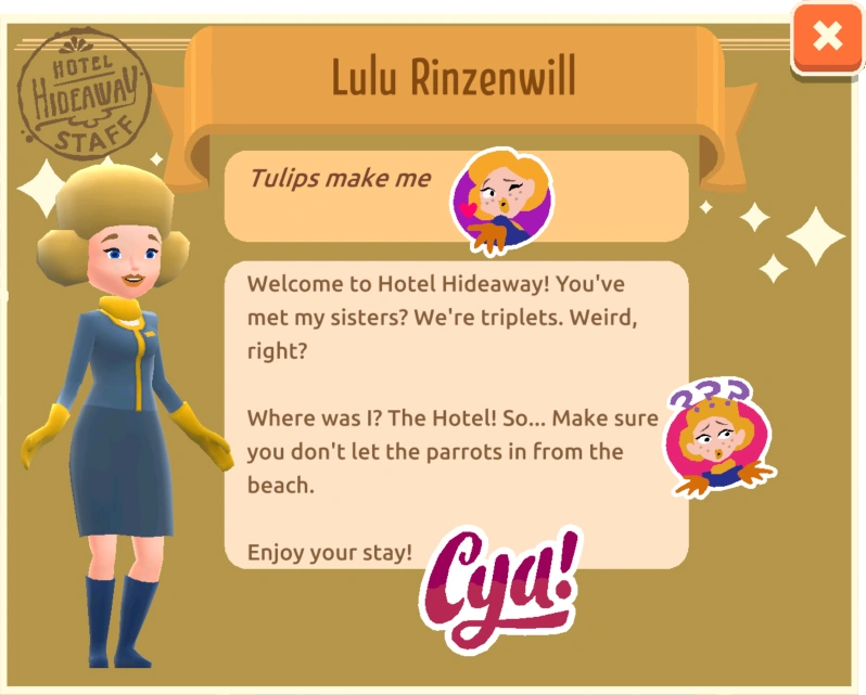 I also don’t know if this is just for. Lulu rincenwill is one of three sisters found working in the hotel. In order to do a gesture, you must drag your finger from one box to another on the gesture pad,. There are 5 collections of stickers throughout the game: Lulu is a triplet, and she likes to stand out. She appears to be the sweetest of the three, and favoured, according to guida. Gestures are specific actions, dances, and movements that can be performed by your avatar. Hôtel hideaway est une communauté virtuelle, située dans un hôtel géré par les sœurs lulu, guida et maxeen, où les utilisateurs peuvent interagir en temps réel, s'habiller, etc. Not sure if i am missing something…but does anyone know why lulu is the only one at the front desk now? You can view the times lulu is at the front.