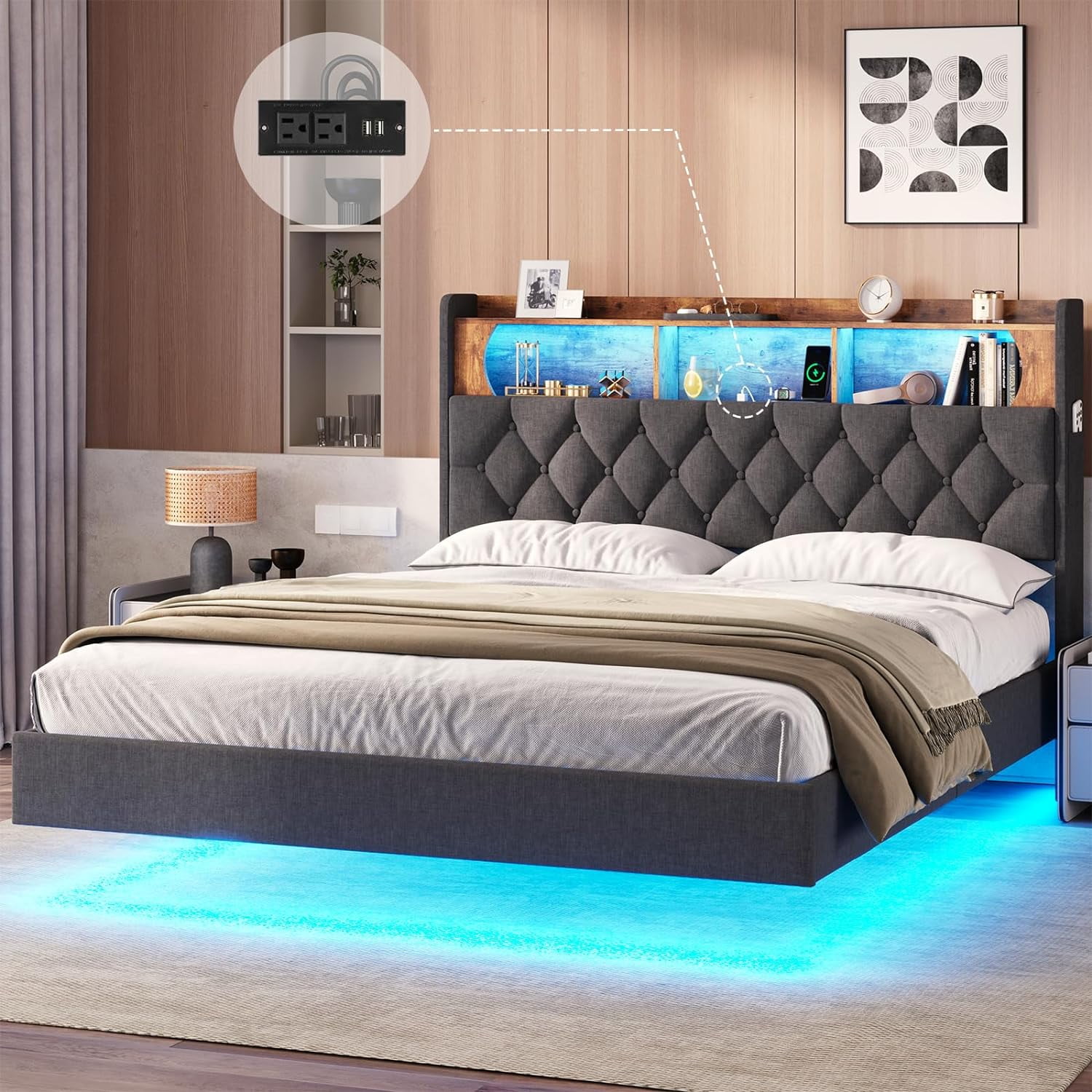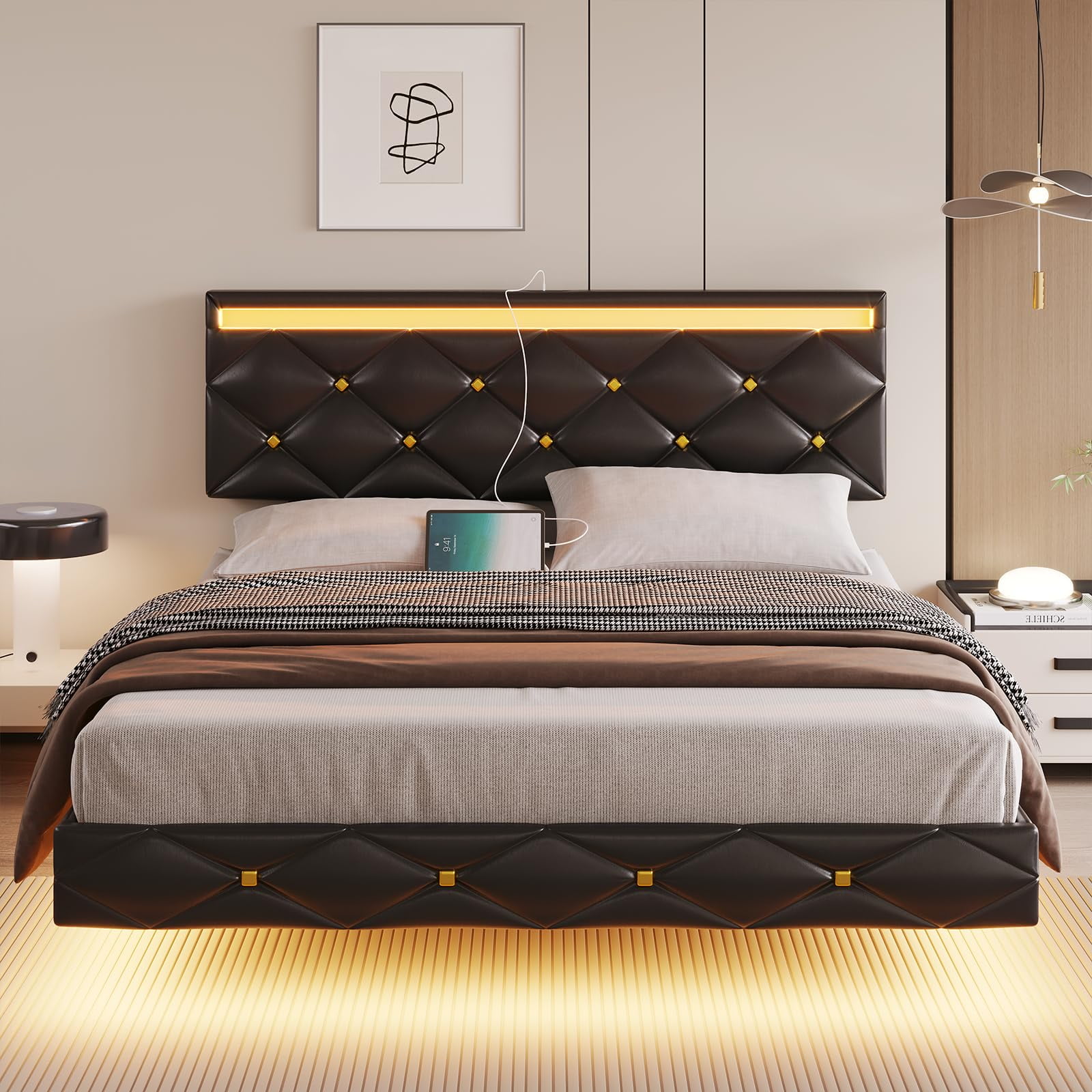 Floating Queen Bed Frame shop whizmax platform floating bed frame with led lights, modern upholstered low profile queen size bed with wingback. 【stable & durable frame construction】dictac floating queen led bed frame with headboard is constructed of solid metal. our queen size floating bed frame consists of a headboard and a bed frame with two tiers and an electrical outlet designed into. you'll love the wrought studio floating bed frame queen size with led lights, metal platform queen bed, no box spring. shop whizmax platform floating bed frame with led lights, modern upholstered low profile queen size bed with wingback.