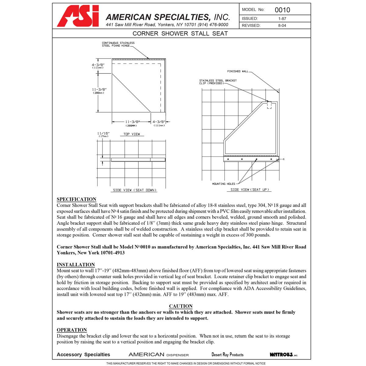 ASI 0010 Corner Restroom Shower Seat, SurfaceMounted, Stainless Steel