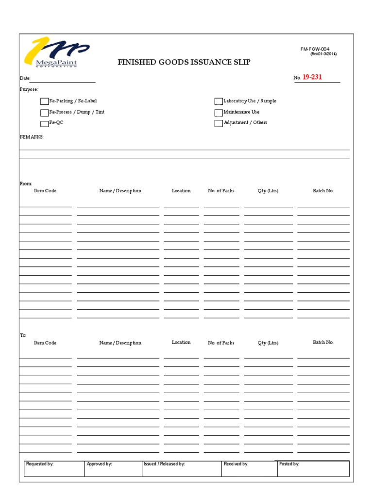 Finished Goods Issuance Slip FMFGW004 PDF