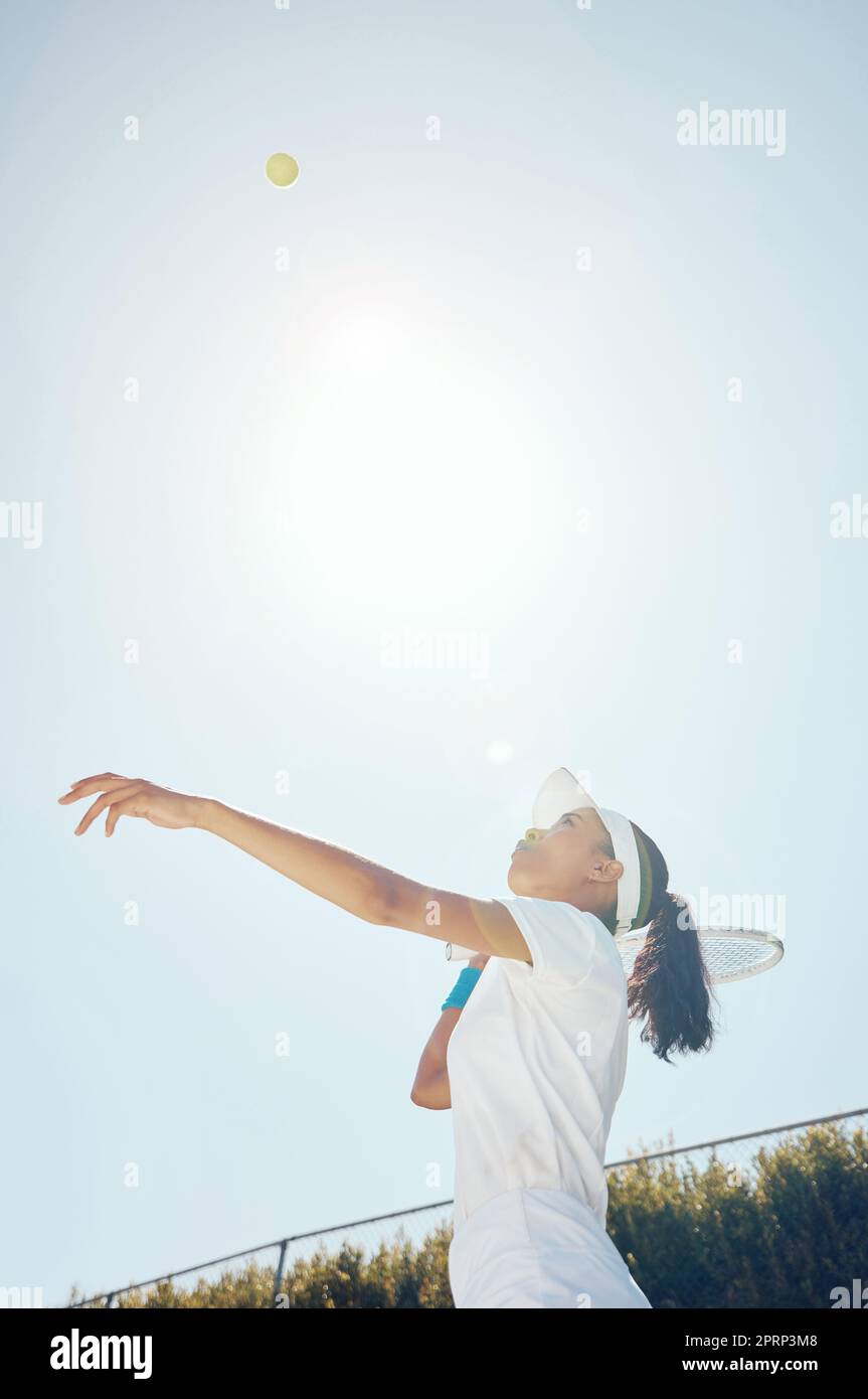 Tennis court, outdoor girl and ball in sky after professional hit with