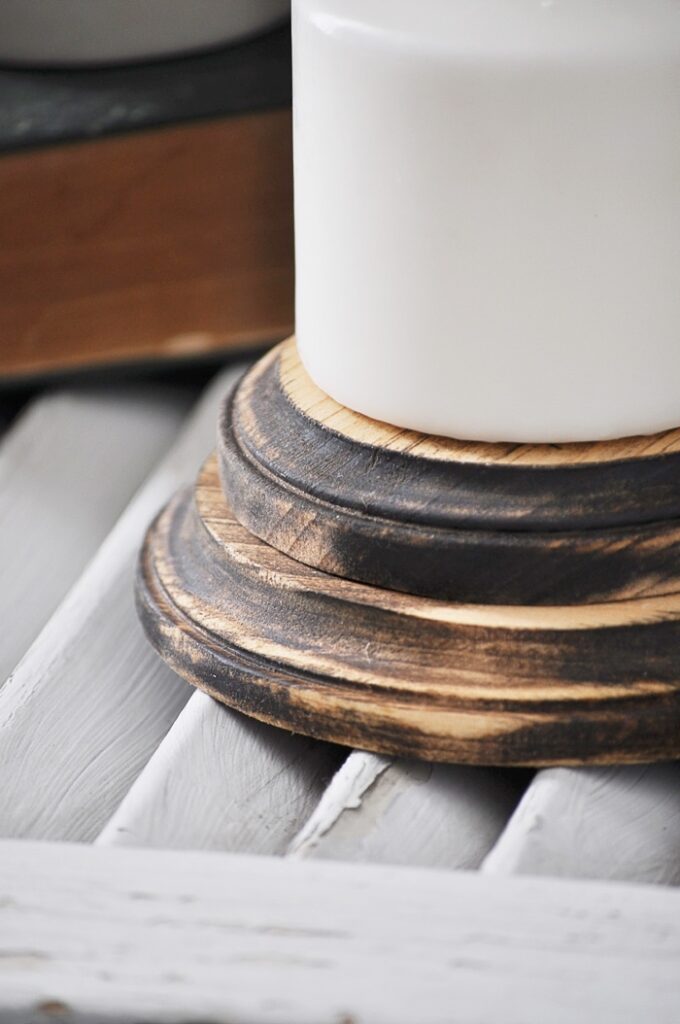 Beautiful DIY pedestal candles (using dollar store items!) from Thrifty Diy Wood Candle Pedestal Wood, saw, and stain is all you need! A tutorial for how to create a wood cake or decor stand using a chunky candlestick and wood round, plus how to give it a weathered look for modern. Create these easy diy farmhouse candle pedestals anyone can make! See how i turned some leftover wood from a 4x4 fence post into. Diy Wood Candle Pedestal.
