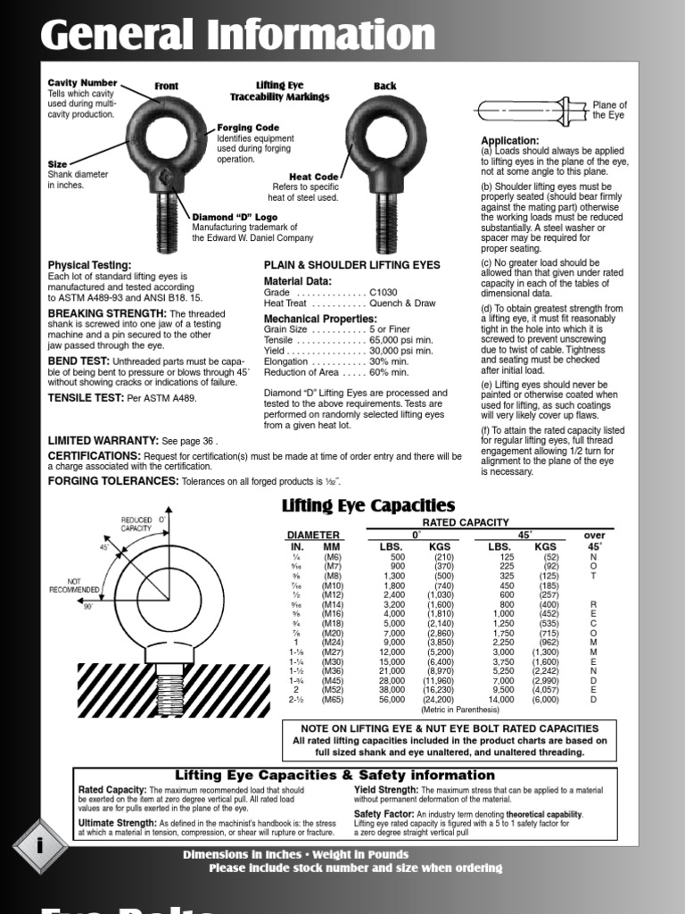 The designs vary but the real advantage is essentially that. These new generation lifting points offer advanced engineering and increased load capacities over standard eyebolts. Load limits are based on a safety. The chart is according to asme. Regular eye bolts have a working load limit which should be taken into consideration when used for lifting or supporting an overhead load. Din 580 specification specifies the properties of steel and stainless steel eyebolts and provides information on their correct use in lifting operations (as part of slings and as load. Metric threads safe working load single eyebolt axial. Our guide will explain what eye bolts are, the different types, their uses, sizes, and lifting capacity. Forged eye bolt capacity and strength chart to show rated load capacities, proof load and breaking strength of a selected forged threaded eye bolt. (metric threads)when used in pairs for inclined loading conditions.