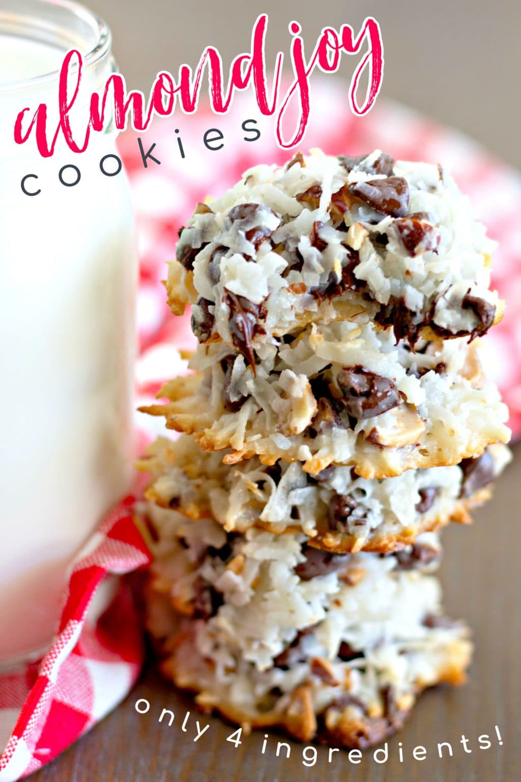 Almond Joy Cookies Learn how to make easy and delicious almond joy cookies with only four ingredients: No eggs, no flour, no oil or butter needed. Coconut, condensed milk, almonds and chocolate chips. All the flavors you love in almond joys, now in these easy almond joy cookies! No mixer, no chilling, just stir and bake for ooey gooey perfection. Learn how to. Almond Joy Cookies.