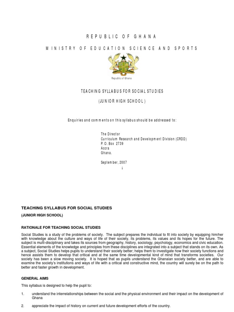 Social Studies JHS 13 PDF Educational Assessment Test (Assessment) Social Studies Jhs Curriculum The national curriculum framework broadly brings learners into contact with an agreed range of areas for teaching and learning experiences. Download the new ges jhs syllabus (the common core programme ccp) which is a carefully designed programme that caters for learning areas that all learners are expected to study from jhs 1 (now known as bs7) to shs 1 (aka. Social Studies Jhs Curriculum.