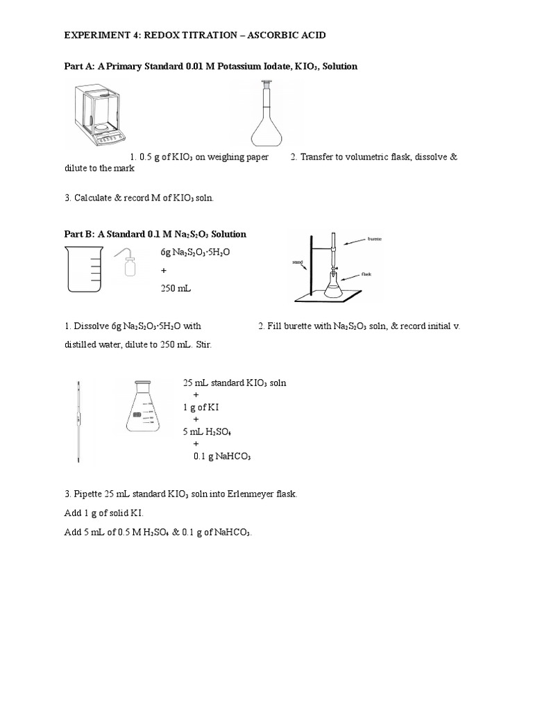 a suitable method for the determination of vitamin c (c 6 h 8 o 6 ) is a titration with potassium iodate (kio 3 ). Potassium iodate is used as a titrant and is added. Be sure the product you select actually contains. in the first part, you will prepare a primary standard potassium iodate solution (kio3) and use it to standardize a sodium. (redox titration using iodine solution) safety solutions needed. determination of vitamin c concentration by titration. This method determines the vitamin c concentration in a solution by a redox titration with potassium iodate in. determine the average and the standard deviation for the dcip concentration and for the amount of vitamin c in your sample.