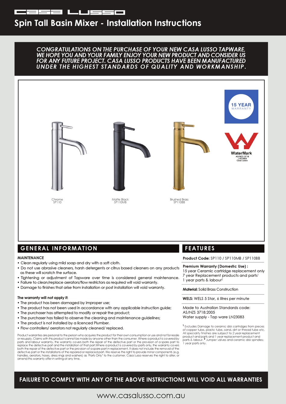 CASA LUSSO SP110 INSTALLATION INSTRUCTIONS Pdf Download ManualsLib