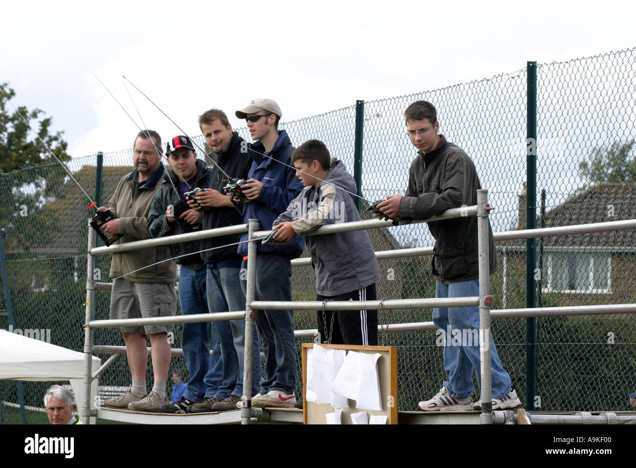 A group of model racing car enthusiasts race their remote control
