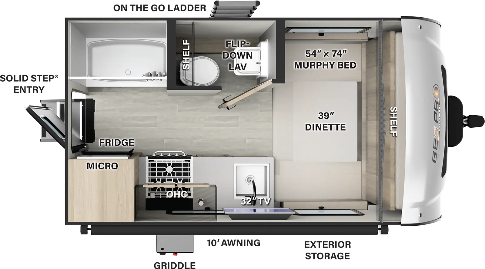 Travel Trailer Geo Pro Our trailers with the best in style and amenities while keeping your towing needs in mind. Laminated clay with alloy band fiberglass sidewalls. Outside griddle with lp hookup. Our geo pro travel trailers are everything you want and need in a camping experience in a package that is easily towable. Your ideal floor plan, perfectly sized. Your ideal floor plan,. Travel Trailer Geo Pro.