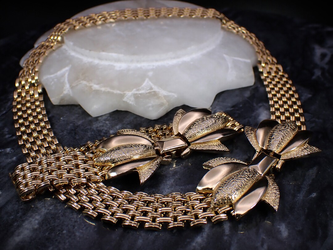 Vintage Gold Tone Basket Weave Link Bow Clasp Necklace & Bracelet Demi