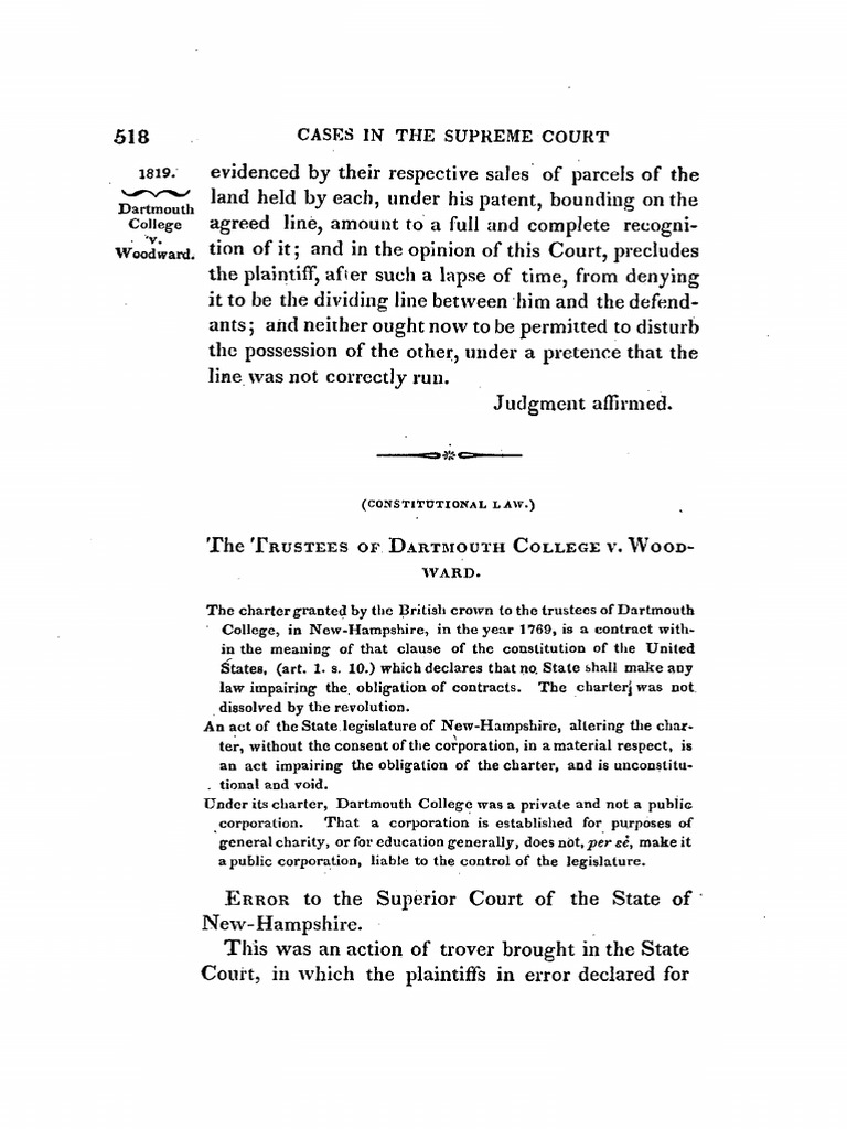 Dartmouth College v. Woodward 1819 Dartmouth College V Woodward Scotus Ruling The trustees of dartmouth college v. 481 (1819), the supreme court ruled that the state of new hampshire had violated the contract clause in its attempt to install a new. Supreme court case in which the court held that the charter of dartmouth college granted in 1769 by king. Woodward, the new secretary of the. The legislature changed the school's. Dartmouth College V Woodward Scotus Ruling.