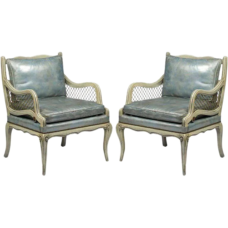 1940s Carved and Lacquered Lounge Chairs With Blue Leather Upholstery