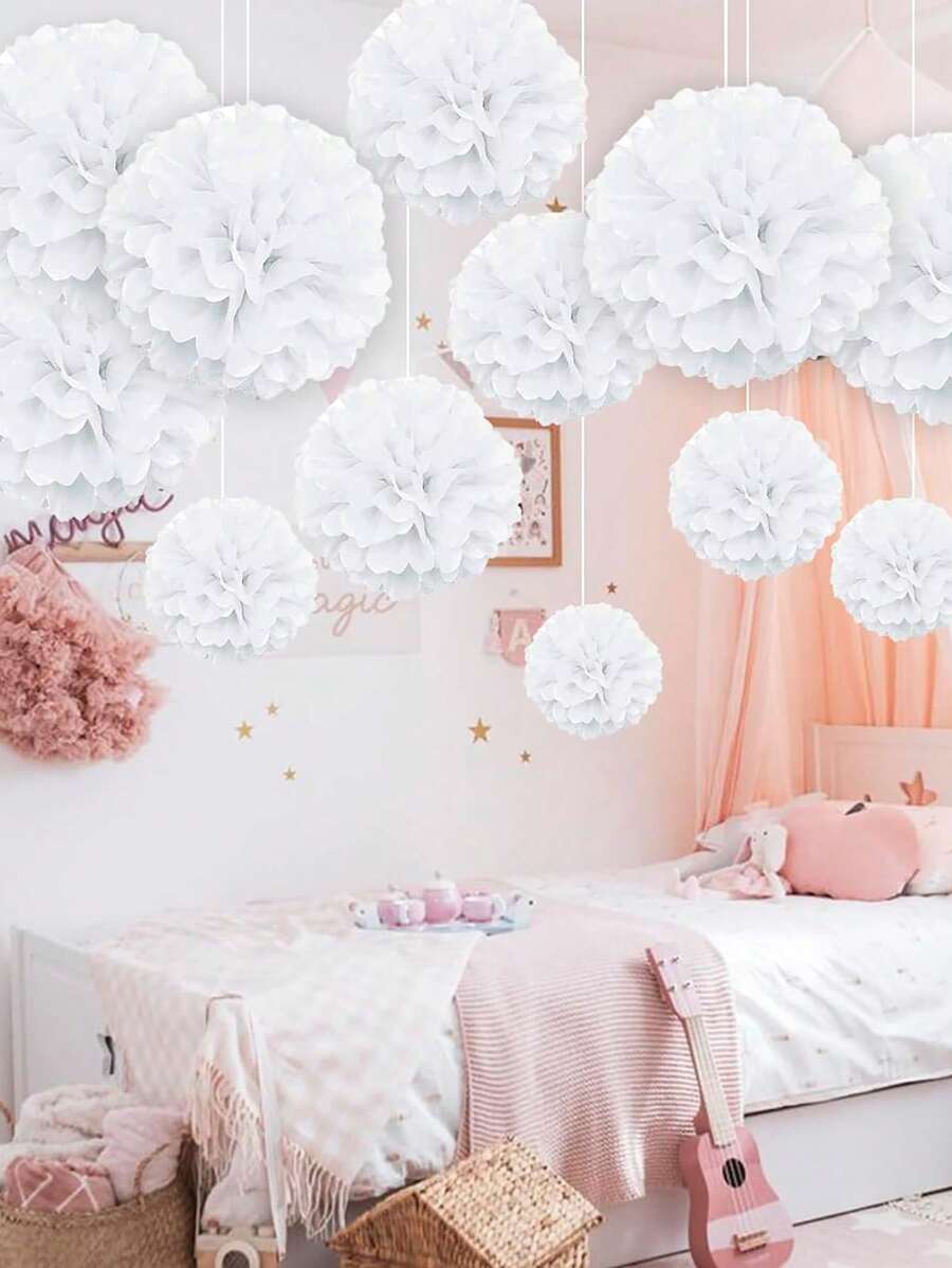 10pcs/Set White Tissue Paper Pom Poms, Hanging Paper Flower Balls For