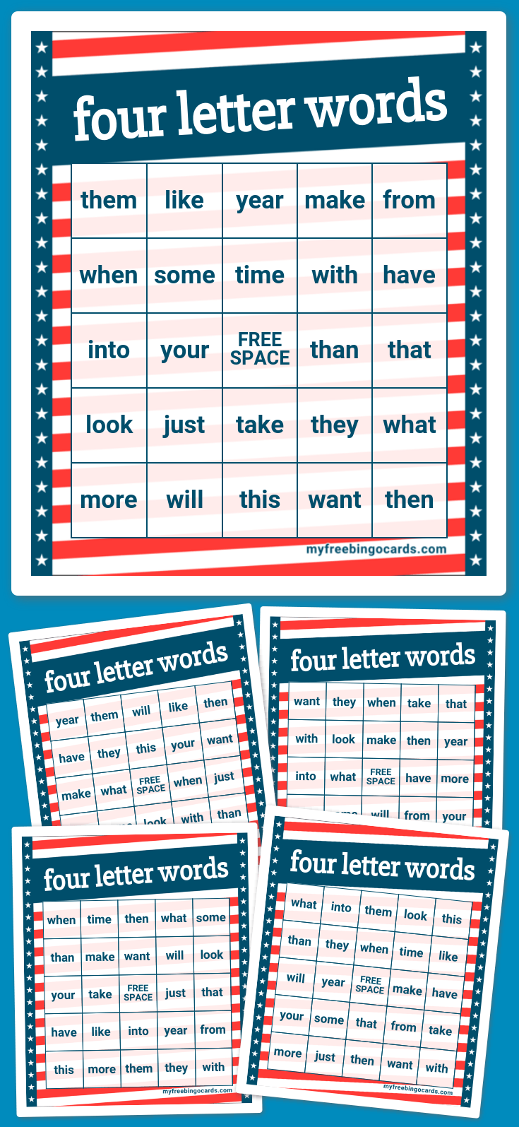 Kids four letter words bingo