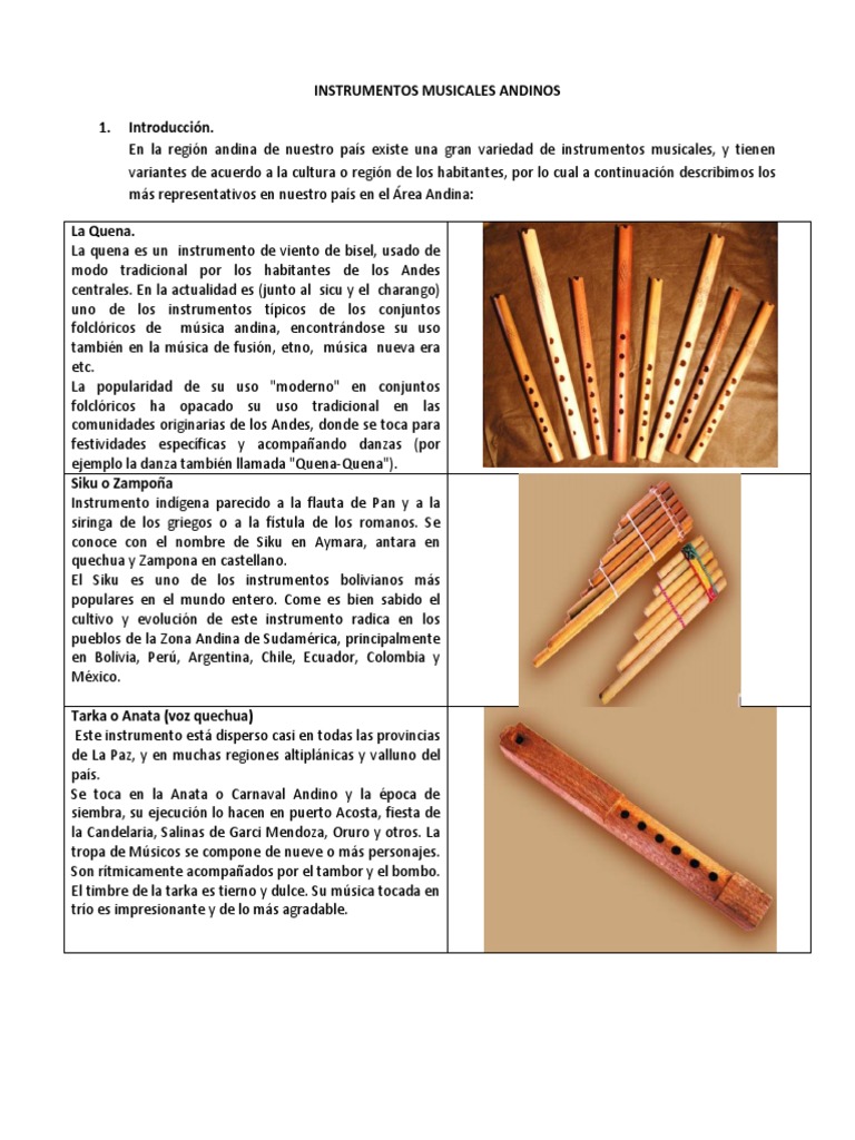 Catálogo virtual de instrumentos andinos (página 2) Instrumentos Musicales Andinos Conoce algunos de los instrumentos más emblemáticos de la música andina, como la quena, el charango, el siku, el ronroco y la tarka. Los instrumentos más comunes en esta música incluyen la guitarra, el tiple, la bandola, la quena y el bombo. Descubre 11 instrumentos de viento originarios de los andes, desde la quena hasta el pututo, pasando por la. Instrumentos Musicales Andinos.