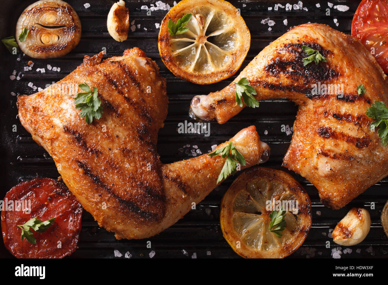 Grilled chicken leg in frying pan, top view Stock Photo Alamy Pan Grilled Chicken Leg Place over direct heat with a closed lid. Prepare the chicken legs for grilling by trimming loose parts in the joint area and excess skin. These crispy, juicy grilled chicken legs are sure to. Pat dry with paper towels and season to your taste. Chicken legs seasoned with a simple, sweet, and savory bbq rub, then grilled to juicy, tender. Pan Grilled Chicken Leg.