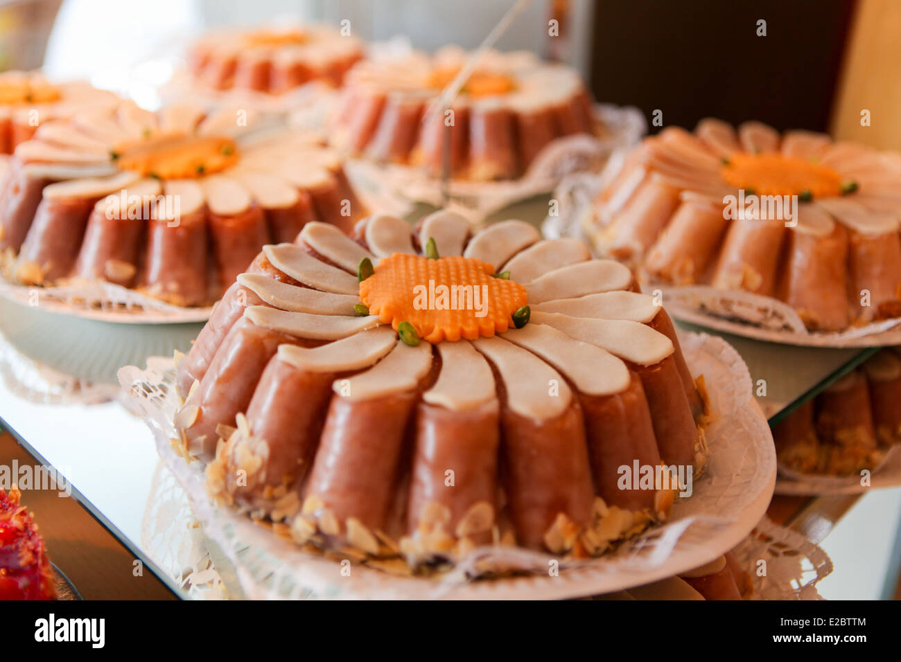 Typical sweet pies in a bakery store in Cologne, Germany Stock Photo