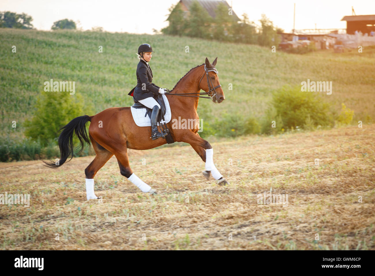 woman riding brown horse wearing helmet Stock Photo Alamy