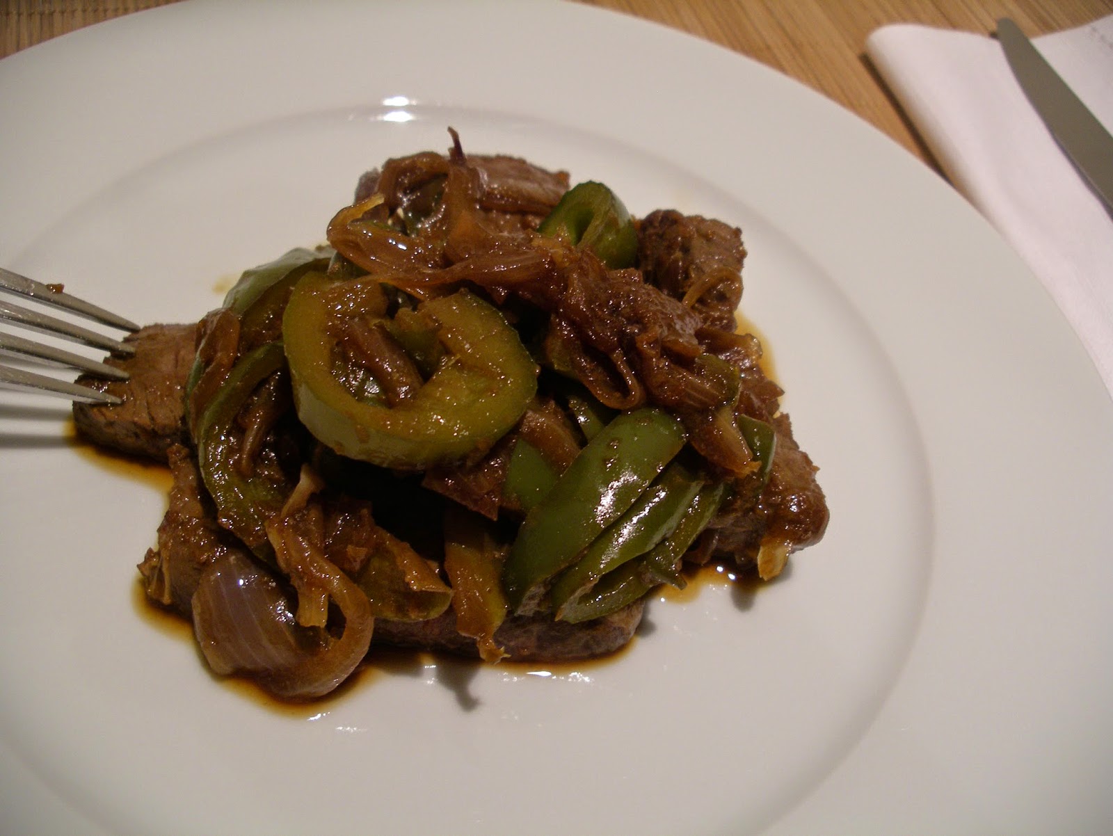KITCHEN IN THE SAND Asian style strip steak (with peppers, onion and gingersoy sauce)
