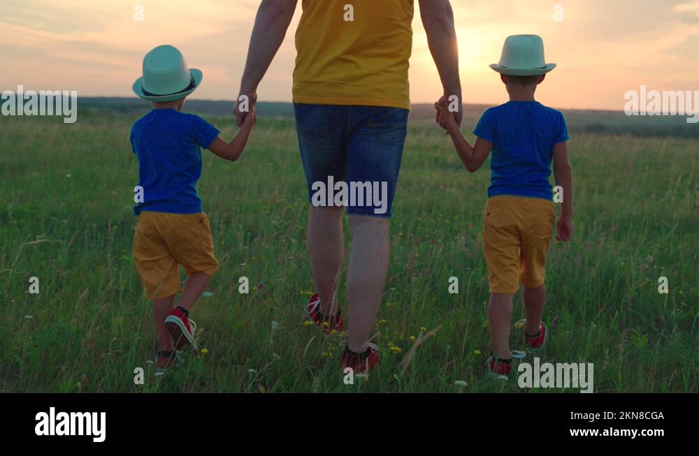Dad and children walk holding hands in park in sunshine. Happy family